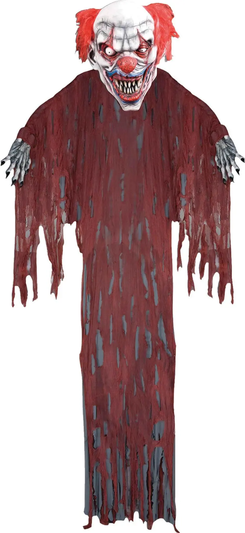 12′ Tall Hanging Evil Clown-Â With a large, deranged clown face that features classic makeup, red nose, and bright orange hair, he’s truly a ghastly sight to behold. Boney skeleton hands stretch out to his sides, while a long tattered red gauze robe makes him look large and menacing.