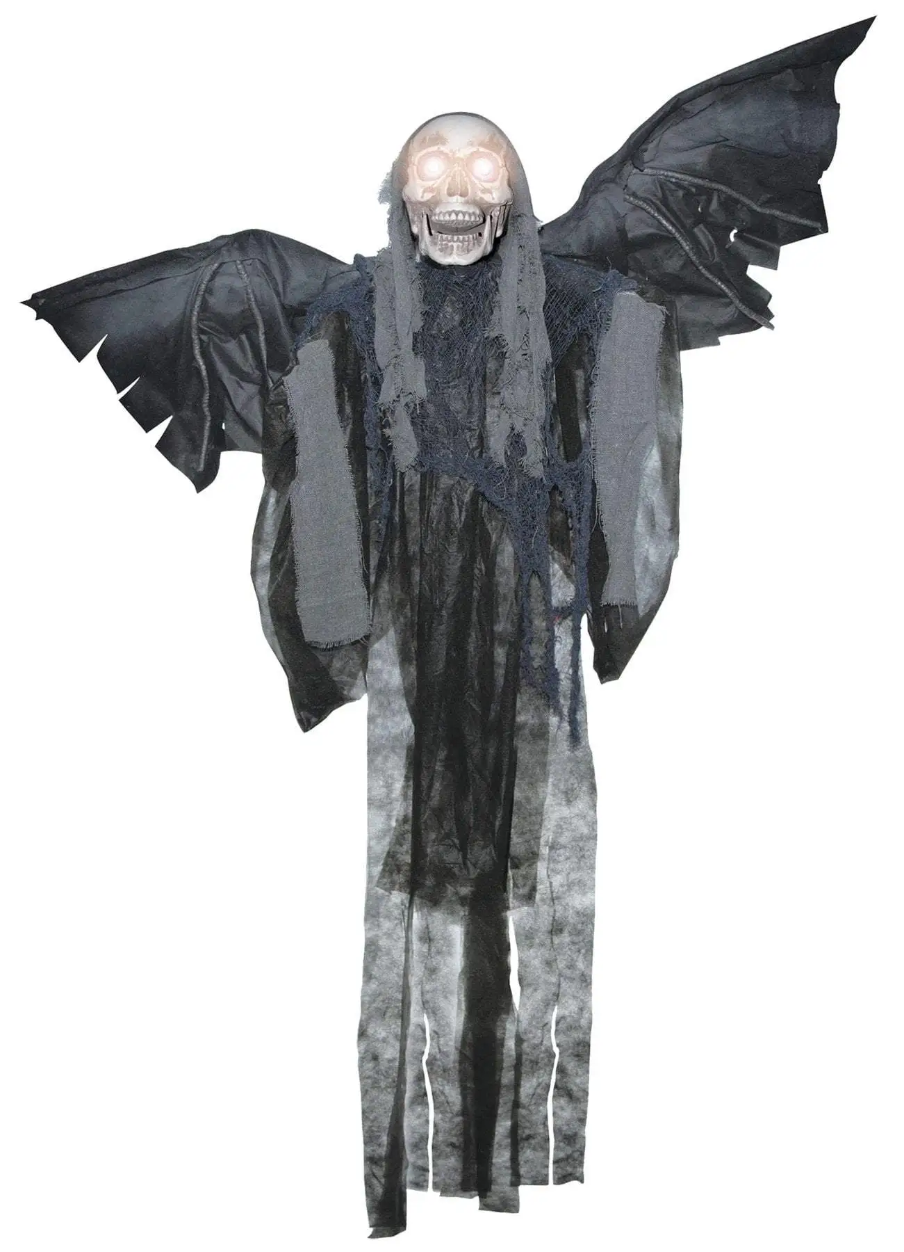Animated Flying Reaper-Â Plastic skeletal parts(arms are posable) with rotted, shredded look rags attached with large spread posable wings that move up and as though they were flapping, makes scary sounds and light up eyes. 38 inches tall and 52 inch wing span. Requires 3 AA batteries, not included.