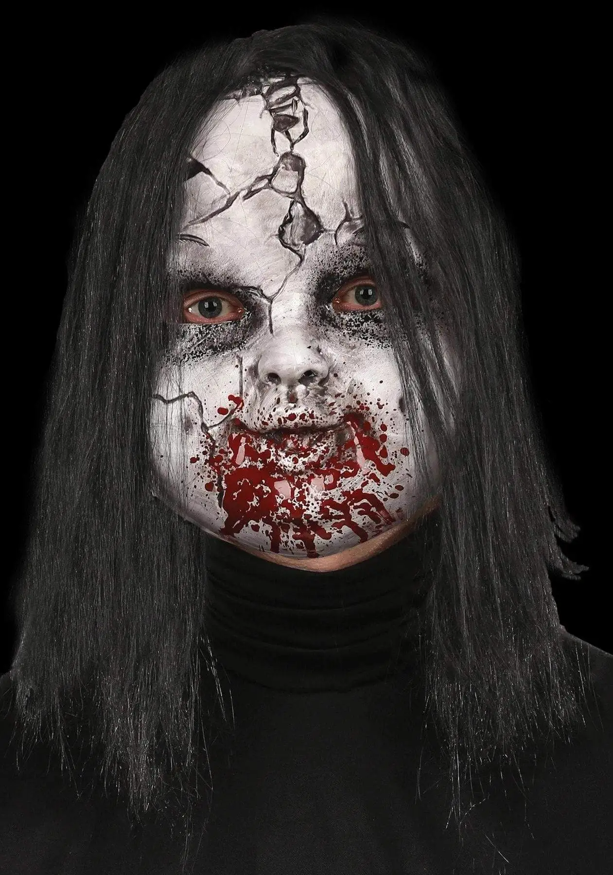 Creepy baby doll face mask with black synthetic hair at the front has an elastic strap and foam square at forehead for comfort. 100% PVC. One size fits most adults.