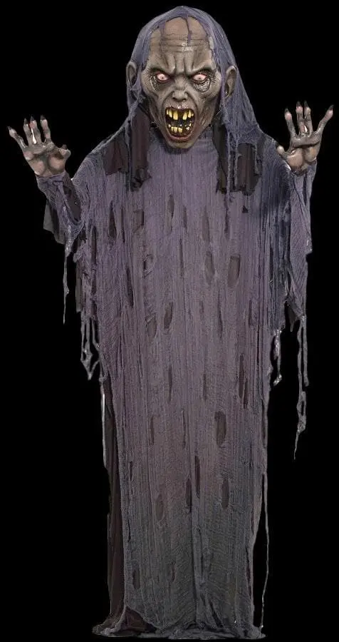 Great for a haunted house or your own home display. 12 foot hanging zombie with large polyfoam head and hands with frame draped with black robe and tattered gauze.