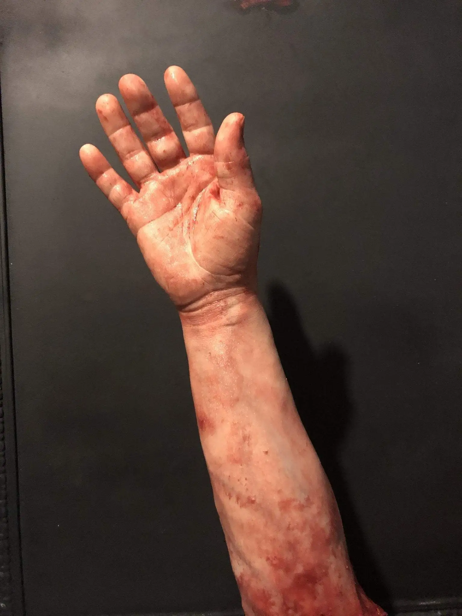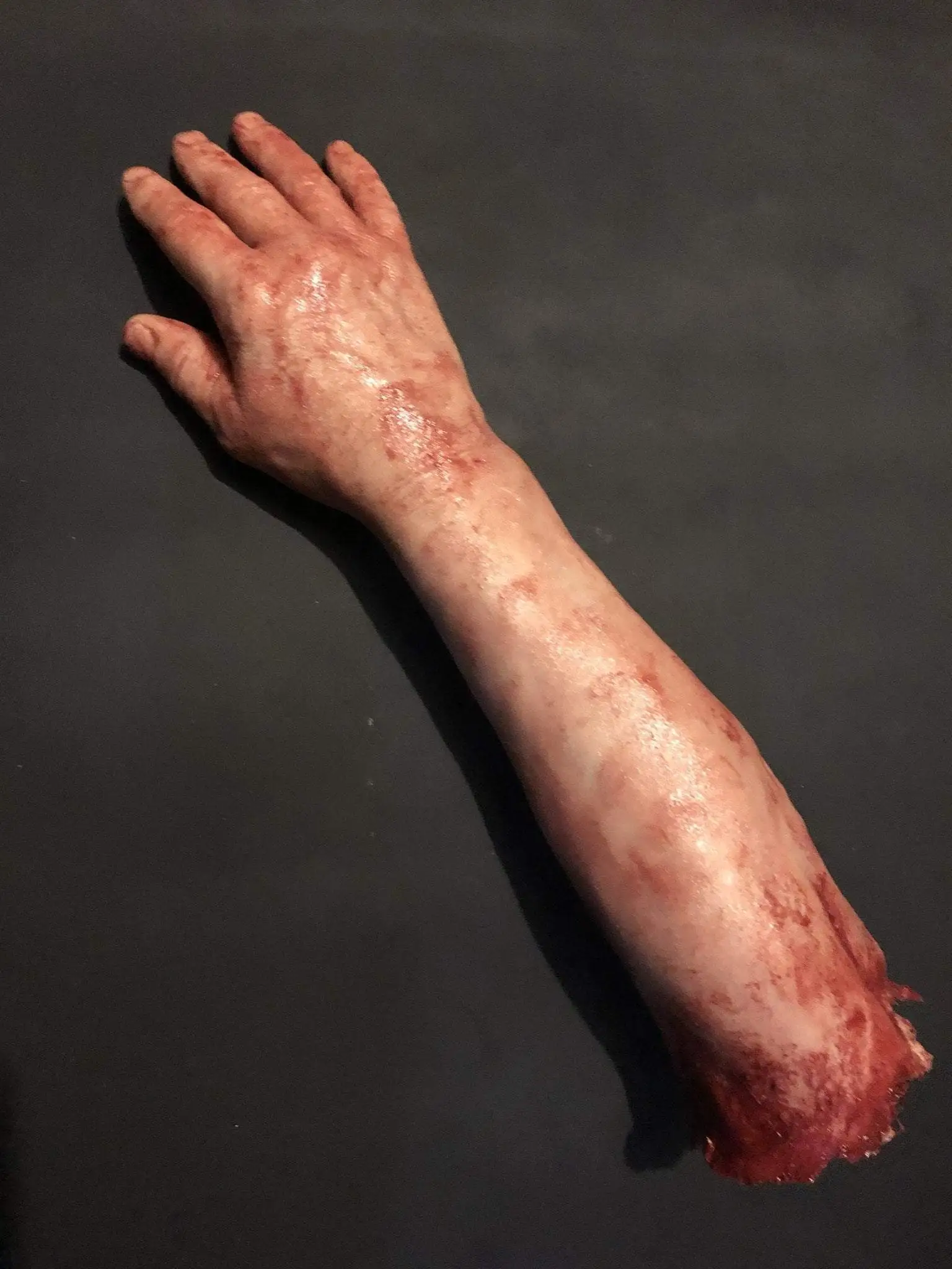 This severed right male arm is made of solid silicone “not foam filled” Extremely detailed and film ready. It has the weight and movement of a real arm. Scarring and blood splatter can be customized as well as hair or skintone just send a message along with purchase. If not specified arms come as in pics. Each arm is hand painted separately so each one is unique. A perfect addition for your haunt, film project ,or just for smacking around your friends .