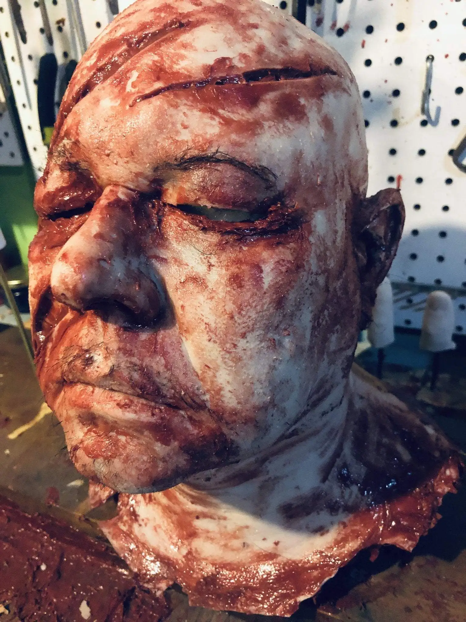This severed head is skinned in silicone and foam filled. Highly detailed with minor facial hair, all hand punched. Scarring and blood splatter can be customized to your liking , as well as hair color and style. Just attach a message during time of purchase and inquire about other options.