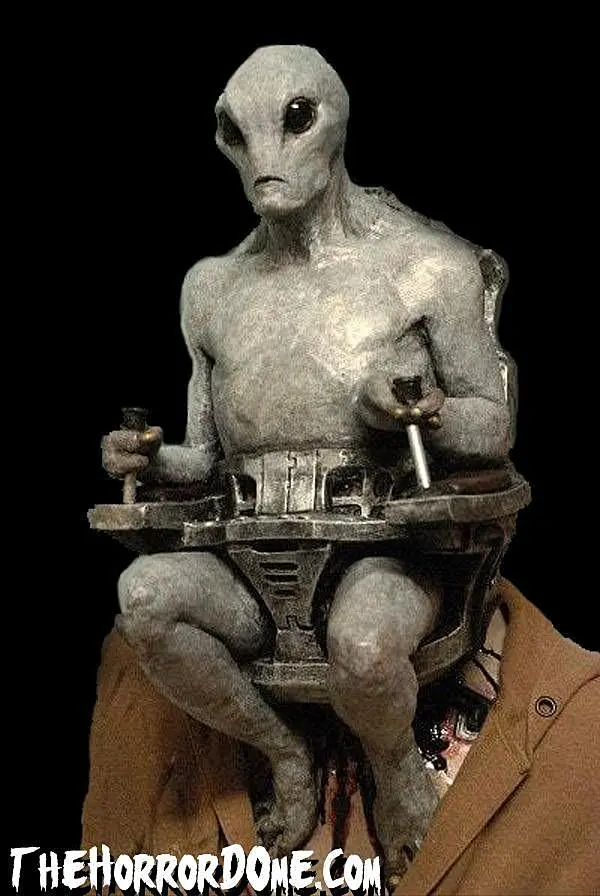 A little grey alien sits at the controls and directs his human host to commit violent acts in the name of colonization. Blood seeps out of the victim’s neck while the otherworldly devil fulfills his mission. Can this man be freed, or has too much of his brain been destroyed?
