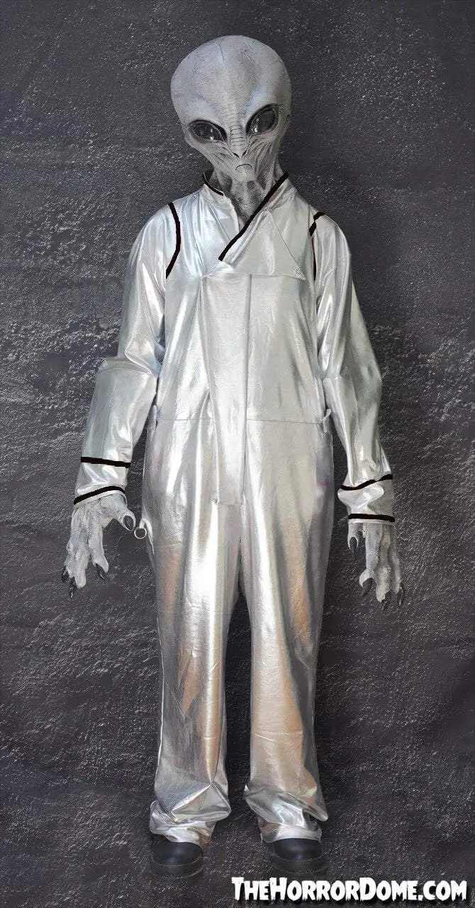 This nonresident alien comes with everything you see. Area 51 Alien Mask, High End shimmering Movie-quality silver spacesuit, and Alien full latex gloves.Â